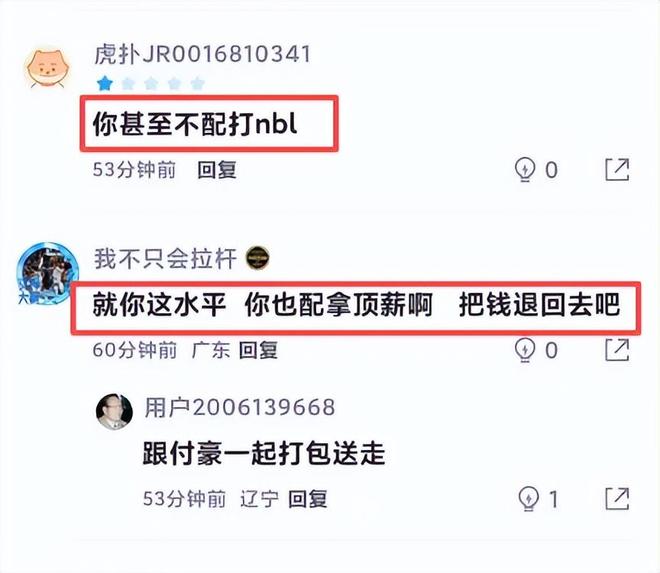 在全隊12人登場,10人正負(fù)值達(dá)到兩位數(shù)的情況下,范子銘作為北京隊內(nèi)僅有的3名頂薪球員,正負(fù)值卻差點為負(fù)值,屬實讓人難以置信。也難怪,賽后有球迷吐槽:“你甚至不配打NBL”、“就你這水平,你也配拿頂薪,把錢退回去吧”、“能被楊文學(xué)連續(xù)單吃兩次的應(yīng)該不多了”......